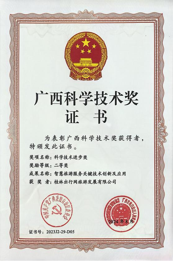 近日,自治区党委、政府在南宁召开全区科技大会、广西科学技术奖励大会,揭晓了2023年度广西科学技术奖获奖成果名单。其中,桂林投资集团桂林出行网旅游发展有限公司科技成果“智慧旅游服务关键技术创新及应用”荣获2023年度广西科技进步二等奖。