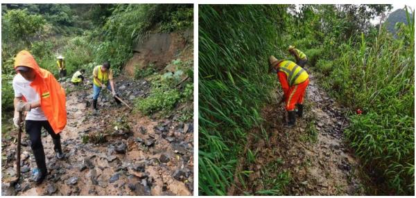 321国道辖区内出现山体滑坡,应急人员第一时间做好警示工作,在护坡处开槽进行雨水引流,有效预防了雨水冲刷,防止人员受灾。