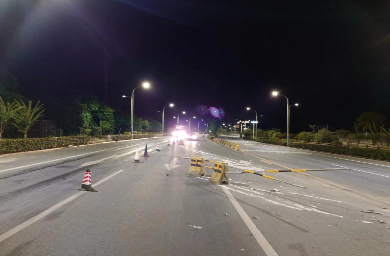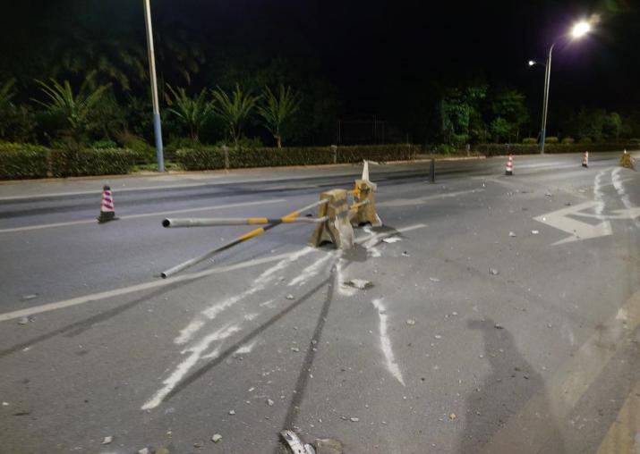 “桂林到阳朔路段321国道阳朔县北公交站路口段发生一起交通事故,一辆轿车因操作不当撞上路中心隔离栏,造成道路中央水泥隔离护栏损坏约60米。”。凌晨3点,一条紧急的道路损坏报告打破了深夜的寂静,阳桂公司值班室人员接到突发险情通知后,迅速上报情况,公司立即启动应急预案,一支由安全警戒疏导、技术施工人员和机械设备组成的紧急抢修队伍在最短的时间内集结完毕,火速奔赴事故现场。