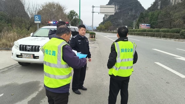 为进一步消除国道321线交通安全隐患,保障群众出行安全,近日,桂林市阳桂公路管理有限公司联合阳朔县公安局交通管理大队,对国道321雁山收费站至阳朔路口段开展隐患路段专项排查行动,通过系统化治理全面提升道路安全水平。