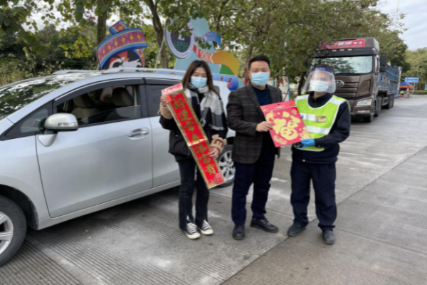 2022年春运开启后,桂林交通控股机场路管理公司启动“平安春运 情满八桂公路”活动,派出志愿者在桂林收费站外收费广场设点,准备好矿泉水、防疫物资、修车工具等物品,为往来的司乘人员提供便民服务,并热情地给外地车辆赠送春联、“?!弊?,守护异乡游子陆续踏上归途。