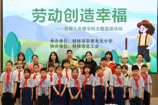 “五一”国际劳动节之际,由桂林市总工会主办的“劳模工匠进学校思政教师进企业”宣讲活动走进桂林市崇善龙光小学,桂林公交劳模夏四初受邀参加活动并为100余名师生上了一堂生动的思政课。