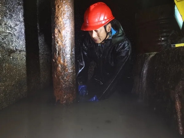 ▲图为甘建军正在洪水中抢修。