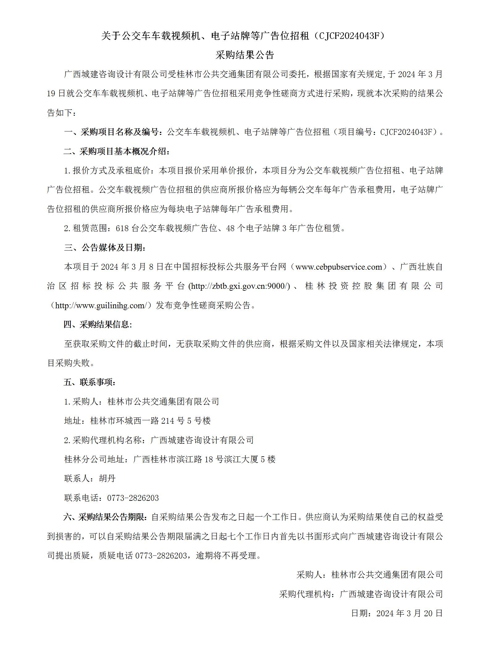 关于公交车车载视频机、电子站牌等广告位招租(CJCF2024043F) 采购结果公告