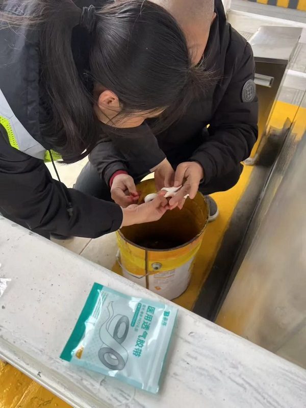正在车道值班的收费员见状,立刻上前安抚:“师傅别慌,我们马上帮你处理!”随后迅速用对讲机向值班班长紧急报告。值班班长闻讯后,即刻拎起应急药箱赶往现场,搀扶司机至安全岛,对司机伤口进行处理,另一名值班人员也迅速携带补充应急物资赶来支援。