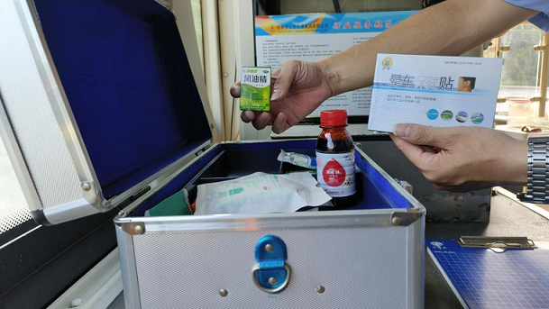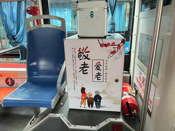敬老爱老公交专线车厢内贴心的设置了应急医药箱,放置了速效救心丸、跌打损伤药、创口贴、纱布等老年人常用药物物资,方便乘客应急情况使用,全方位呵护乘客的安全。