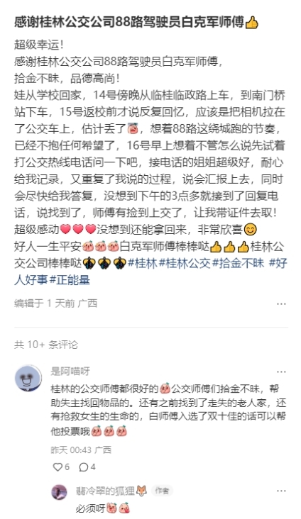 “感谢桂林公交公司88路驾驶员白克军师傅”……近日,桂林投资集团桂林公交88路驾驶员白克军师傅拾金不昧的善举在“小红书”里传播开来,赢得了市民网友的点赞。