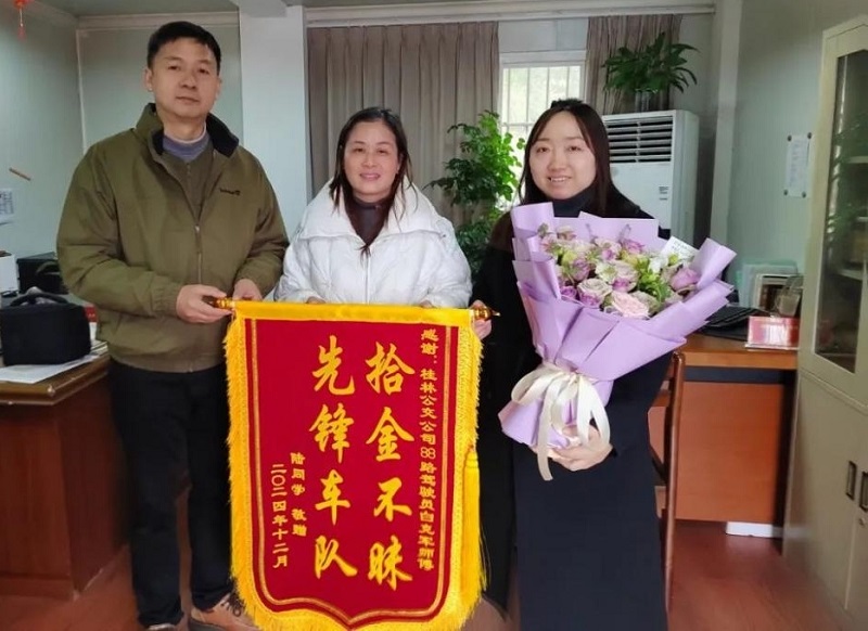 随后,蒋女士夫妇还带着 “拾金不昧,先锋车队” 的锦旗与鲜花来到公交公司,亲自向白师傅表达了诚挚的谢意。