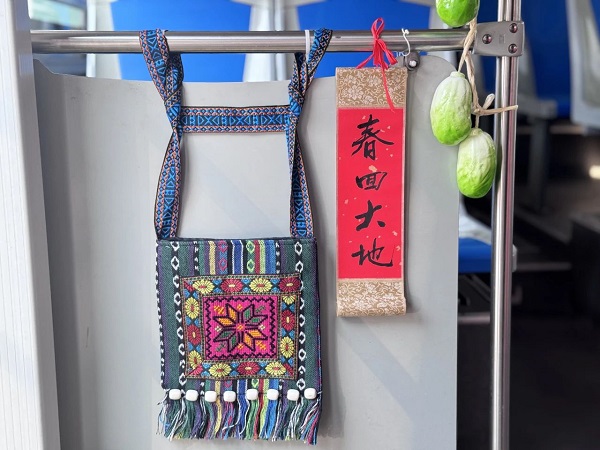 走进车内,就像踏入了一个民族风情的小世界。车顶悬挂着精美的花朵装饰,摇曳生姿。红彤彤的绣球、写满祝福的卷轴错落有致,“?!弊钟搿叭氯弊盅涯坑窒睬?,色彩斑斓、绣工精美的壮族特色挎包挂在一旁,每一针每一线都诉说着民族工艺的精湛,传递着浓浓的节日氛围。