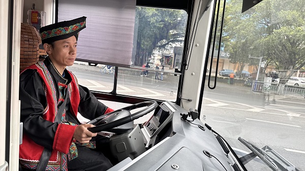 更惊喜的是司机师傅,身着传统壮族服饰,头戴特色帽子,衣服上绚丽的刺绣图案,传递着“三月三”的欢乐与祝福。