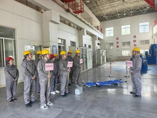 演练以发电厂房内“重物坠落、有人受伤”的示警声启动。站长赶赴现场评估伤者伤情后,指令各小组集结,停止所有作业、切断设备电源,启动起重伤害专项应急救援预案。抢险救援组携液压顶杆、急救担架等工具到位,确认无二次坠落风险后解救伤者并转移危险物品;医疗救护组同步搭建临时救护点,对伤者开展止血、消毒、包扎、固定等急救操作;后勤保障组划定警戒区域,疏散无关人员、维护现场秩序,调配应急物资,并安排专人勘查现场留存关键信息。