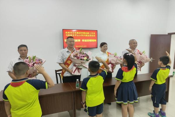同学们的到来,受到了劳模们的热情欢迎和接待。在二楼会议室,党十九大代表、全国劳动模范夏四初、自治区劳动模范曹春停、胡天顺、“桂林市五一劳动奖章”获得者莫伟平这些桂林交控集团清廉代表们用风趣幽默的话语,向在场的同学们及家长分享了在工作中发生的小故事,讲述了身边的劳动模范事迹,以言传身教展示了清廉企业中优秀共产党员的风采,上了一堂生动的社会实践课。为给同学们树立“劳动最光荣”“清廉树人风”的观念,夏四初立足平凡的公交驾驶员岗位,讲述自己在车厢运行服务过程中总结出的经验方法,与大家共同分享了公交的发展历程,使同学们近距离了解劳动模范的故事,树立做一个奉献正直的人生价值观。听了劳模们的讲述,同学们不时发出一阵阵惊叹,同时一个个踊跃举手提问:“夏四初阿姨,您为什么会选择成为一名公交驾驶员呢?”“胡天顺叔叔,您觉得您在工作中遇到的最大的困难是什么?”“曹伯伯,您觉得正确的人生价值观是什么” ……针对同学们的提问,劳模们也用有趣生动的方式一一回答,会议室不时响起欢声笑语??翁蒙?,桂林公交的劳模们还与同学们玩起了互动小游戏,在游戏中,让同学们了解在乘坐公交车时,哪些现象是不文明的,哪些东西是禁止携带的,在轻松活跃的环境中达到了寓教于乐的效果。劳模鼓励同学们要自觉传承和弘扬雷锋精神,做一个清廉正直的人,树立为民服务意识,把爱心传递给社会有需要的人群。下课后,同学们向劳模们献上了鲜花,大家纷纷表示,要以劳模叔叔阿姨为榜样,热爱祖国、热爱劳动,从小树立一个正确人生观,通过劳动和磨炼意志、清廉友爱,长大后做对祖国建设有用的人才。